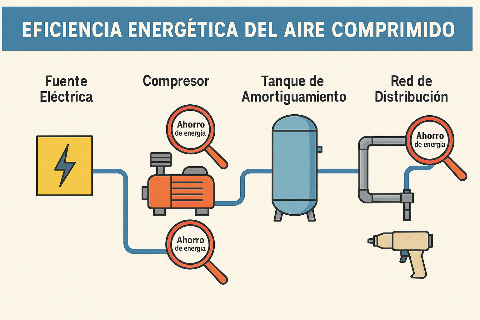 Sin embargo, se estima que el 50% del aire comprimido generado se desperdicia por fugas, sobredimensionamientos, pérdidas en distribución y operación ineficiente.